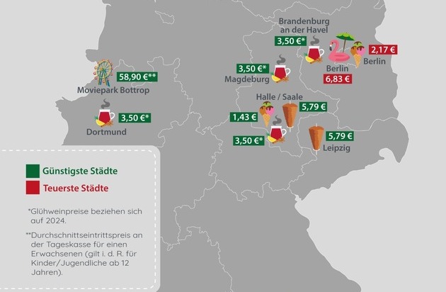 Eine Tasse herkömmlicher roter Glühwein kostet 2024 im Bundesdurchschnitt 4,24 Euro – etwa 7 % mehr als im Vorjahr. In tourismusgeprägten Großstädten müssen Durstige tiefer in die Tasche greifen als auf Weihnachtsmärkten in kleinstädtischen Regionen. Die Preise schwanken zwischen 3,50 Euro in Brandenburg an der Havel, Stralsund, Dortmund, Halle an der Saale sowie Magdeburg und 6 Euro auf dem Münchner Weihnachtsmarkt. Berlin, Köln und Hamburg klettern mit 5 Euro pro Becher ebenfalls über den errechneten Mittelwert. Günstiger trinkt das Festmarktpublikum in Mannheim, Augsburg und Kiel. Dort verlangen Standinhaberinnen und -inhaber ab 3,75 Euro für das süffige Vergnügen. Wie bei Eis- und Freibadpreisen erklären höhere Energie- Personal und Rohstoffkosten weitgehend den kräftigen Anstieg. Für 2025 erwartet der Bundesverband der Deutschen Weinkellereien einen Preisanstieg von regional maximal 10 %. Ein Becher des warmen Fruchtweins liegt auf den größeren Weihnachtsmärkten dann bei voraussichtlich 5 Euro. [6]