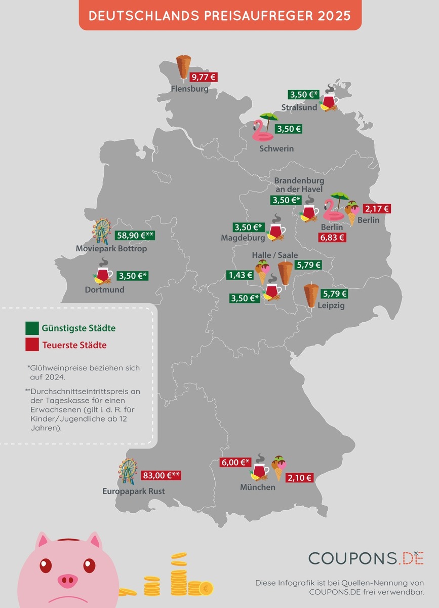 Döner, Freibad, Freizeitpark: Deutschland zahlt drauf. Der aktuelle Preisvergleich des Gutscheinanbieters COUPONS.DE liefert einen Überblick über regionale Preisunterschiede sowie Kostenwicklungen seit 2022 und deckt auf, in welchen Lebensbereichen es besonders schmerzt.