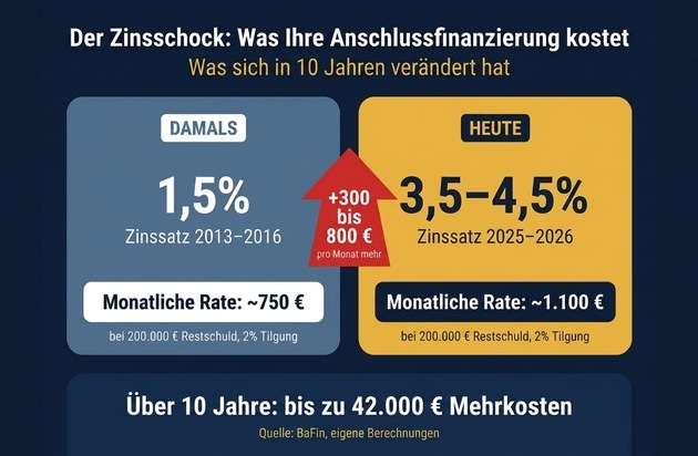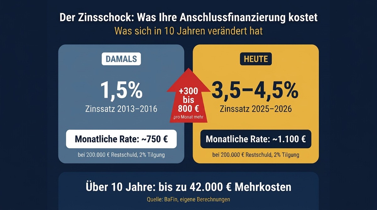 Wer heute eine Anschlussfinanzierung abschließt, zahlt – je nach Laufzeit und Bonität – Zinsen zwischen 3,5 und 4,5 Prozent. Das kann bedeuten: Ihre monatliche Rate steigt plötzlich um 300, 500 oder sogar 800 Euro. Die Bundesanstalt für Finanzdienstleistungsaufsicht (BaFin) warnt ausdrücklich: "Im schlimmsten Fall können Restschuld und Zinsdifferenz so hoch sein, dass die monatliche Rate nicht mehr aufgebracht werden kann. Dann kann die Anschlussfinanzierung sogar scheitern." Das ist die Realität, der sich gerade Hunderttausende Eigentümer in Deutschland gegenübersehen.