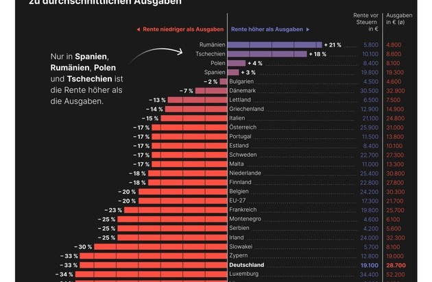 Die Studie macht zudem die extremen Wohlstandsunterschiede sichtbar: Während ein Rentner in Luxemburg durchschnittlich über 52.000 Euro pro Jahr ausgibt, liegt das Ausgabenniveau in Bulgarien und Rumänien bei rund 4.500 Euro. In Deutschland, Frankreich und Italien bewegen sich die Kosten zwischen 24.000 und 29.000 Euro.