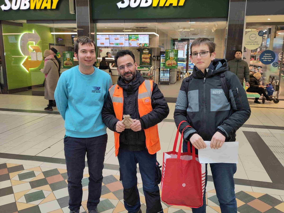 Der Verkehrsclub Deutschland (VCD) und der Fahrgastverband PRO BAHN setzen nicht nur auf den Ausbau nachhaltiger Mobilitätsformen, sondern möchten auch auf die Menschen aufmerksam machen, die diese täglich ermöglichen. Das Personal von Bus und Bahn ist rund um die Uhr im Einsatz, steuert Züge, stellt Weichen und Signale, hilft Fahrgästen weiter. Selbst an ungewöhnlichen Tagen wie Heiligabend und Weihnachten wird der Betrieb keineswegs eingestellt. Im Gegenteil: Ferienzeit heißt Reisezeit. Der VCD Hessen unterstützte in diesem Jahr erstmals die seit drei Jahren bestehende Weihnachtsaktion des Fahrgastverbandes PRO BAHN am 24.12. in Frankfurt am Main. Konkret verteilten ehrenamtliche Mitglieder beider Verbände gestern Mittag kleine Geschenkpäckchen an Mitarbeitende der Deutschen Bahn und anderer Verkehrsunternehmen an drei Bahnhöfen. Am Morgen begann die Dankesaktion in Aschaffenburg, mittags wurde sie nach der Zugfahrt dorthin im Frankfurter Hauptbahnhof sowie am Südbahnhof fortgesetzt, wo sie gegen 17:30 Uhr endete. Die gut gefüllten Päckchen enthielten weihnachtliche Köstlichkeiten wie Schokoladen-Nikolausfiguren, Nüsse und Mandarinen. „Die täglichen Störungen, Ausfälle und Verspätungen sind nicht nur ein Ärgernis für uns Fahrgäste, sondern betreffen auch die Bahnmitarbeitenden selbst", sagt Philipp Loth vom VCD Hessen. Die Beschäftigten leisten häufig Überstunden und leiden unter einem Schichtplan, der oft nicht unregelmäßiger ausfallen könnte und kaum Raum für Freizeit lässt. „Mit der Weihnachtsaktion betonen wir, dass die Interessen der Mitarbeitenden bei der Bahn und im ÖPNV die gleichen sind wie die uns Fahrgäste: ein verlässliches und gut ausgebautes Netz", fasst Elias Manzanares vom Fahrgastverband PRO BAHN zusammen. An Weihnachten wird der tägliche Einsatz der Mitarbeitenden deutlich, denn während viele Familien gemeinsam die Feiertage genießen und das Jahr ausklingen lassen, sorgen sie dafür, dass die Familien überhaupt zusammenfinden. Jeden Tag machen die Mitarbeitenden im Nah-, Fern- und Güterverkehr dies möglich und tragen dabei eine riesige Verantwortung. Dafür möchten wir uns herzlich bedanken! „Die vielen positiven Reaktionen und Lächeln der Bahnmitarbeitenden haben uns sehr gefreut und zeigen, wie wichtig und wirksam Wertschätzung ist.", so Philipp Loth und Elias Manzanares abschließend.