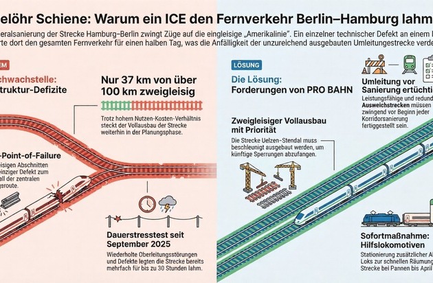 Der Fahrgastverband PRO BAHN kritisiert, dass ein einziger technischer Defekt ausreicht, um die zentrale Umleitung der neunmonatigen Vollsperrung Hamburg–Berlin komplett lahmzulegen. „Dieser Vorfall ist kein Pech – er ist die vorhersehbare Konsequenz eines seit Jahrzehnten verschleppten Streckenausbaus", erklärt Professor Lukas Iffländer, stellvertretender Bundesvorsitzender vom Fahrgastverband PRO BAHN.