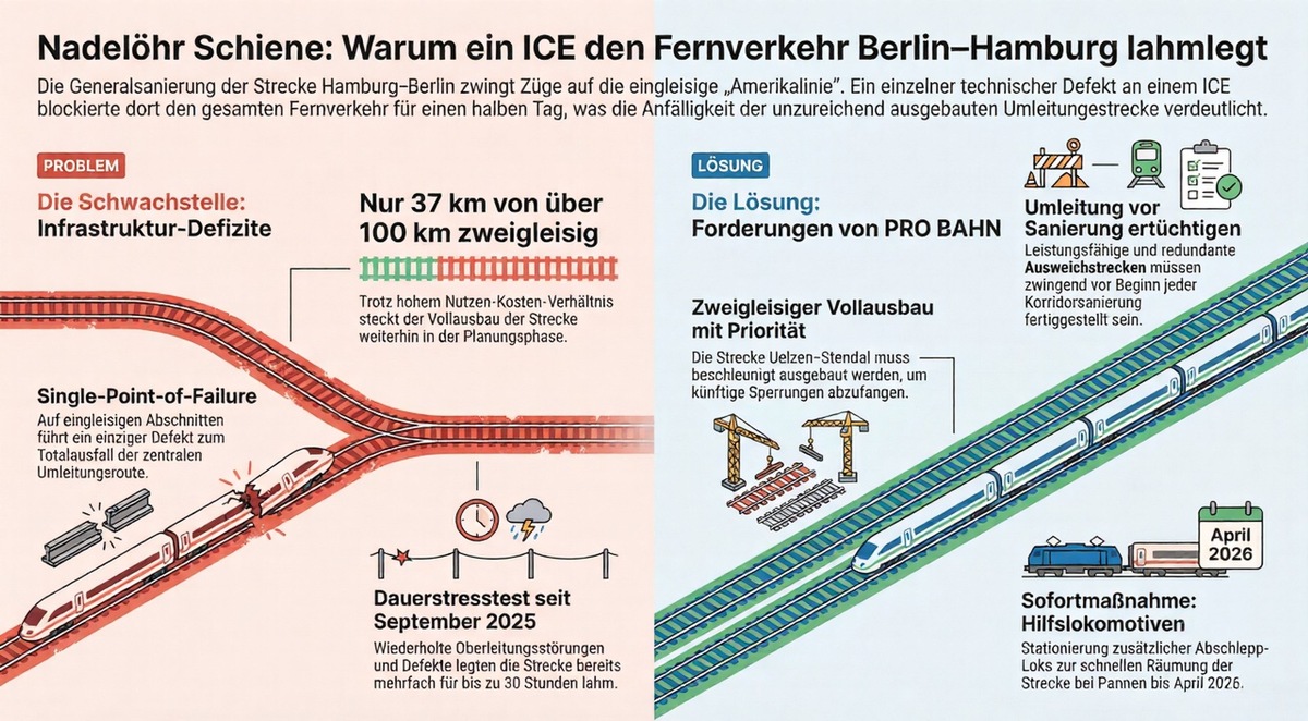Ein einzelner liegengebliebener ICE auf einem eingleisigen Abschnitt der Strecke Stendal–Uelzen blockierte über einen halben Tag die wichtigste Umleitungsstrecke der laufenden Generalsanierung Hamburg–Berlin. ICE-Züge mussten über Hannover umgeleitet werden, verspäten sich massiv oder fallen aus. Tausende Fahrgäste waren betroffen.