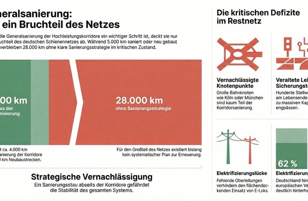 „Die Generalsanierungen sind richtig und wichtig, aber sie sind kein Allheilmittel", erklärt PRO BAHN-Bundesvorsitzender Lukas Iffländer. „Wer glaubt, dass nach der Sanierung der großen Korridore das Netz in Ordnung ist, täuscht sich. Zieht man neben den Hochleistungskorridoren auch die in den letzten Jahren neu gebauten oder in Betrieb genommenen Neubaustrecken ab, warten immer noch rund 28.000 Kilometer Strecke sowie zahlreiche Knoten, Stellwerke, Brücken und Bahnhöfe dringend auf Erneuerung."