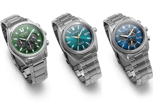 Eine weitere Chronographen-Variante mit Eco-Drive - in den ZifferblattfarbenSchwarz, Blau, Grün und Silber. Citizen bietet diese neuen 40-mm-Modelle mit dem Inhouse-Werk H504 an und ermöglicht so ein flaches Gehäuse (10,29 mm). Die Solarzellen sind hier als Totalisatoren (Hilfszifferblätter) auf den Stunden-Positionen 2, 6 und 10 integriert. Die Gangdauer liegt bei 180 Tagen, die Ganggenauigkeit bei +/- 15 Sekunden im Monat und die unverbindliche Preisempfehlung bei 299 Euro.
