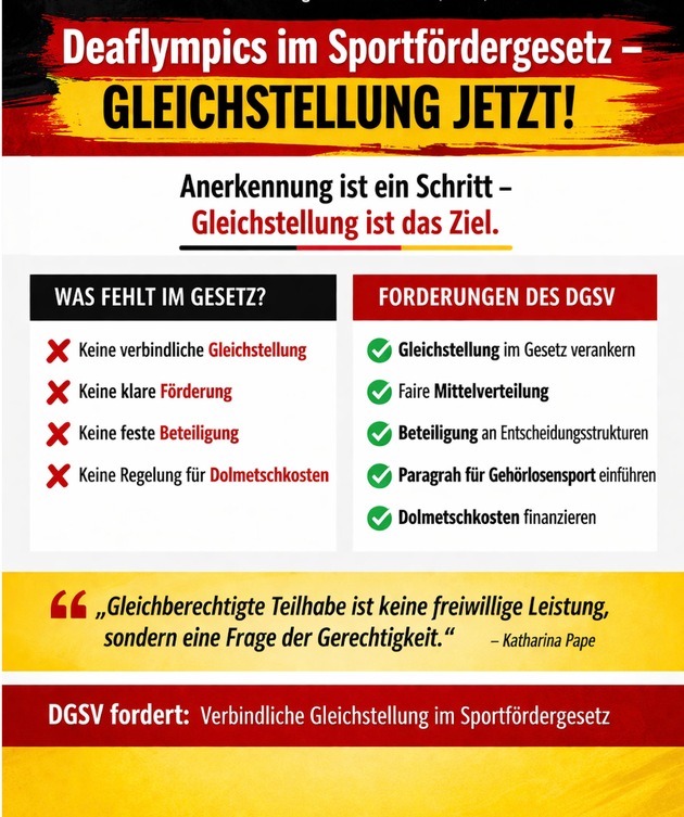 Abschließend unterstreicht die Präsidentin, Katharina Pape: "Die Gleichstellung des deaflympischen Sports ist nicht nur eine sportpolitische Notwendigkeit, sondern ein klares Signal für Inklusion, Teilhabe und Respekt."