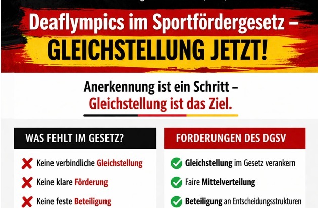 Der DGSV weist darauf hin, dass der aktuelle Gesetzentwurf zwar eine Einbeziehung des deaflympischen Sports vorsieht, jedoch keine verbindliche gesetzliche Gleichstellung mit dem olympischen und paralympischen Sport enthält - weder in den Fördergrundsätzen noch in Entscheidungsstrukturen oder der Mittelverteilung.
