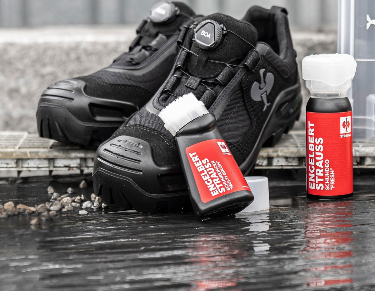 - Die richtige Pflege: Berufs- und Sicherheitsschuhe regelmäßig nachimprägnieren, zum Beispiel mit dem Strauss e.s. 3 in 1 Imprägnierspray. Das erneuert den Schutz vor Feuchtigkeit und Verschmutzung.