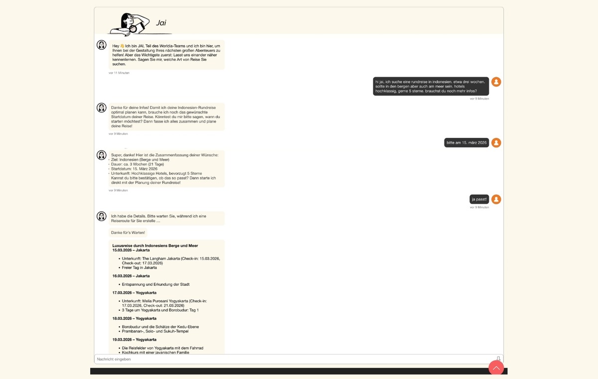 „Reiseberatung bleibt ein persönliches Geschäft. Die Technologie soll lediglich dabei unterstützen, schneller und präziser auf Kundenwünsche zu reagieren“, bemerkt Lisa Gerbens, stellvertretende Geschäftsführerin von WORLDIA. „Mit JAI ermöglichen wir Reisebüros, KI sinnvoll in ihre Arbeitsprozesse zu integrieren.“
