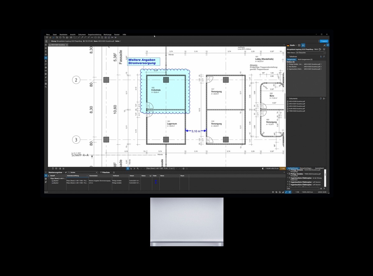 Beispielsweise können Pläne mit der Bauplanmanagement-Software Bluebeam direkt im PDF kommentiert und markiert werden. Diese Markup-Funktion erlaubt es, Änderungen sichtbar zu machen, Aufgaben zuzuweisen und Fortschritte zu dokumentieren – ganz ohne Kommunikationsbruch. Damit wird das Tablet zum zentralen Werkzeug: Der Polier markiert eine Änderung, der Planer sieht sie in Echtzeit, der Bauleiter gibt sofort Feedback. Alle wissen, wer was wann und wie zu tun hat. Alle können es bedienen. Ohne Schulung.