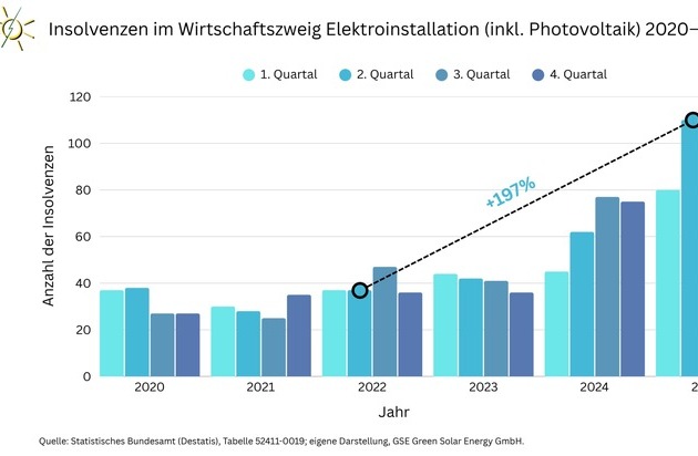 Die deutsche Solarbranche steht unter massivem Druck. Nach Daten des Statistischen Bundesamtes (Destatis) hat sich die Zahl der eröffneten und Mangels Masse abgewiesenen Insolvenzverfahren im Wirtschaftszweig Elektroinstallation, zu dem auch Photovoltaik-Installationsbetriebe zählen, seit 2022 fast verdreifacht. Während im zweiten Quartal 2022 noch 37 Verfahren registriert wurden, waren es im zweiten Quartal 2025 bereits 110.
