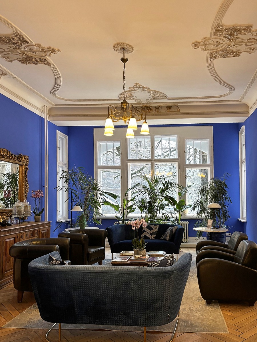 Im besonderen KU64-Charme gestaltet, bietet KU64 - Die KiezPraxis auf 170 Quadratmetern drei Behandlungszimmer, ein Labor, einen Sterilisationsraum, einen großen Wartebereich und einen Röntgenraum. Die Atmosphäre ist cosy, warm und typisch Berlin: sattes Kiezblau an den Wänden, warmes Licht aus kunstvollen Deckenleuchten und bequeme Ledersessel laden zum Zurücklehnen ein. Pflanzen, alte Dielen, ausdrucksstarke Farbakzente und eine Retro-Tapete ergänzen den fein herausgeputzten goldenen Stuck und schaffen eine ruhige, fast wohnliche Umgebung, in der das Ankommen und Durchatmen leicht fällt. Das Besondere: Die Gestaltung stammt nicht von Architekten, sondern wurde vom Team selbst entwickelt und mit viel Liebe zum Detail umgesetzt.