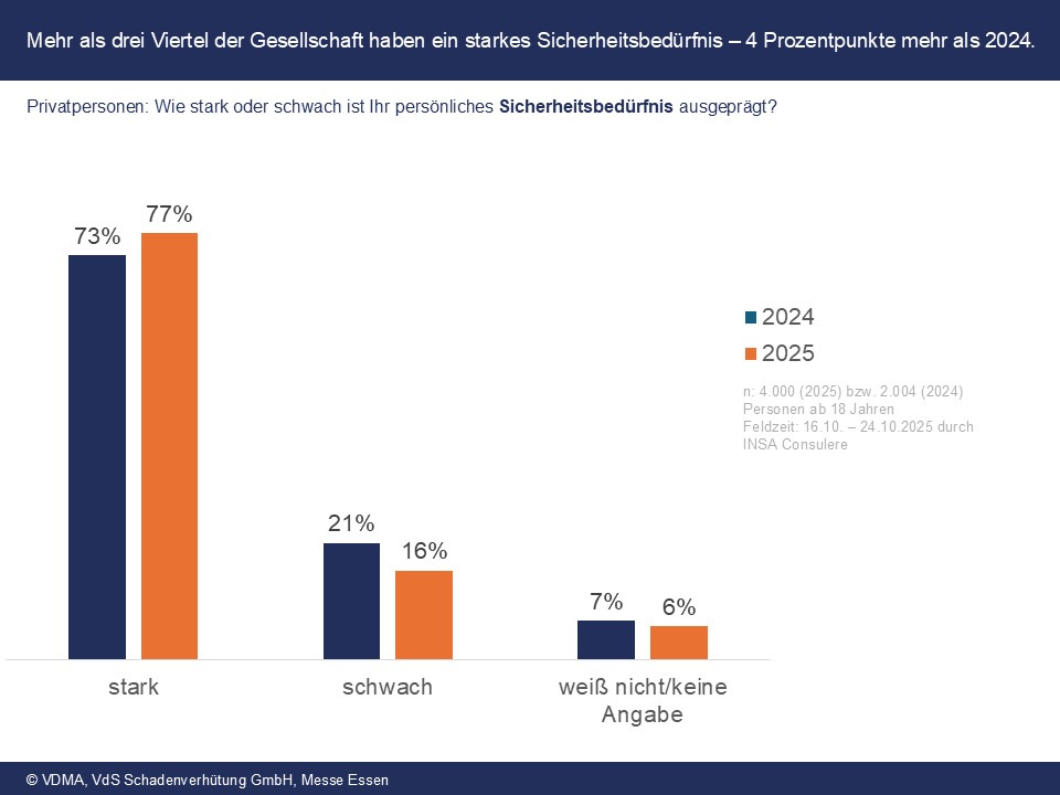 Der Sicherheitsmonitor wurde vom 16. bis 24. Oktober 2025 vom Meinungsforschungsinstitut "INSA Consulere" im Auftrag des VDMA, der Messe Essen und der VdS Schadenverhütung GmbH gemeinsam durchgeführt. Die repräsentative Studie basiert auf einer Befragung von 4.000 Privatpersonen und 1.000 Unternehmen in Deutschland. Die Umfrage soll künftig jährlich durchgeführt werden und wird im September 2026 auf der Fachmesse Security Essen in Essen vorgestellt.