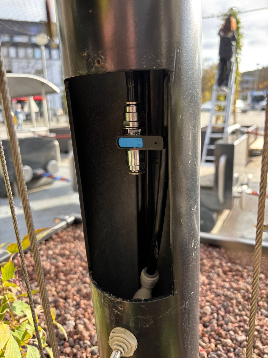 Jeder Segelmast, an dem die Kletterpflanzen emporranken, ist mit drei Vernebelungsdüsen ausgestattet, die auf unterschiedlichen Höhen angebracht sind. Diese Düsen stoßen in regelmäßigen Abständen einen feinen Wassernebel aus, der die Pflanzen befeuchtet und die Temperatur unter dem Sonnensegel merklich senkt. Durch eine zusätzliche Düse an der Rückseite der Masten wird die Erde in den Pflanzkübeln befeuchtet. Eine smarte Pumpentechnik, die an einem der Kübel verbaut ist, sorgt mit Hilfe von Sensoren dafür, dass nur so viel Wasser im System zirkuliert, wie tatsächlich benötigt wird. Das Wasser gelangt über eine Leitung aus dem Boden in den Living-Shade-Kreislauf und wird vor der Vernebelung entkalkt, gefiltert und desinfiziert.