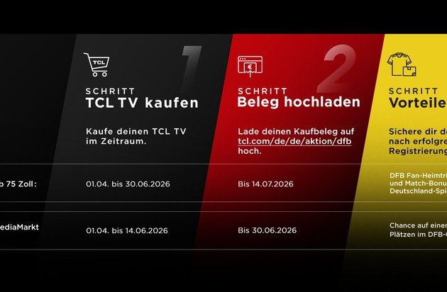 Im Rahmen einer bundesweiten Kampagne rund um das Fußballereignis des Jahres bietet TCL in Deutschland eine Aktion „XXL JUBEL | XXL NACHSCHUB | XXL CHANCE“ für den Kauf eines teilnehmenden TVs an. Alle Prämien sind an den Aktionszeitraum sowie eine anschließende Online-Registrierung gebunden.