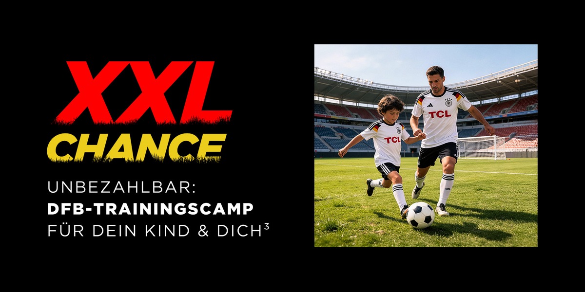 XXL CHANCE: Die Aktion verbindet den Gerätekauf mit einem Gewinnspiel – Käuferinnen oder Käufer eines TCL TVs jeder Größe bei MediaMarkt oder Saturn können an der Verlosung für ein zweitägiges Trainingscamp am DFB-Campus in Frankfurt teilnehmen. Insgesamt stehen 40 Plätze für Kinder mit Begleitperson zur Verfügung, inklusive Unterkunft und Verpflegung. Aktionszeitraum: 01.04. bis 14.06.2026.