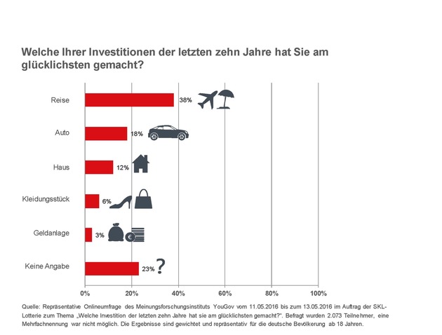 Nicht der Geldgewinn allein macht glücklich, sondern die Möglichkeit, sich damit Erlebnisse zu leisten. So gesehen ist das Ergebnis der aktuellen YouGov-Umfrage im Auftrag der SKL-Lotterie durchaus schlüssig: 38 Prozent der Deutschen sehen eine Reise als jene Investition der vergangenen zehn Jahre an, die sie am glücklichsten gemacht hat. Die nüchterne Geldanlage landet hingegen mit drei Prozent auf dem letzten Platz der auszuwählenden Optionen.