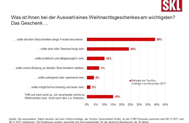 *Quelle: Repräsentative Online-Umfrage des Marktforschungsinstituts YouGov vom 06.11.2017 bis zum 08.11.2017 im Auftrag der SKL-Lotterie zum Thema "Was ist Ihnen bei der Auswahl eines Weihnachtsgeschenkes am wichtigsten?". Befragt wurden 2.099 Teilnehmer. Die Ergebnisse sind gewichtet und repräsentativ für die deutsche Bevölkerung ab 18 Jahren. **Chance auf den Höchstgewinn in der Lotterie: 1 : 500.000; in der Runde 1 : 3.000.000.