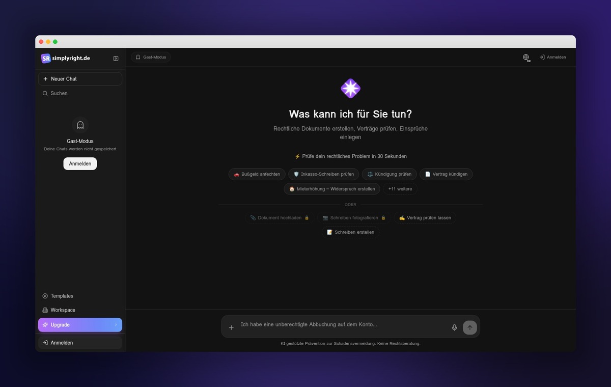 Simplyright setzt auf eine strukturierte und schnelle digitale Abwicklung rechtlicher Anliegen. Nutzer können ihren Fall online schildern und erhalten eine erste Einschätzung, wie die Situation rechtlich einzuordnen ist und welche nächsten Schritte möglich sind. Ziel ist es, eine verständliche Orientierung zu geben und den Einstieg in die weitere Bearbeitung zu vereinfachen.