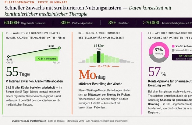 "Eine moderne, digitale Plattform kann dazu beitragen, die strukturellen Kosten der Versorgung deutlich zu senken. Diese Effizienzgewinne sind ein weiteres Argument für eine umfassende Kostenerstattung durch die Krankenkassen, die dadurch noch wirtschaftlicher wird. Wir hoffen, dass die politischen Entscheidungsträger mit der Branche an einer gezielten Regulierung arbeiten, anstatt pauschale Restriktionen zu verhängen, die den Menschen schaden, die sie eigentlich schützen sollen", sagte Sebastian Marincolo, Director of Strategic Content & Editorial bei weed.de.