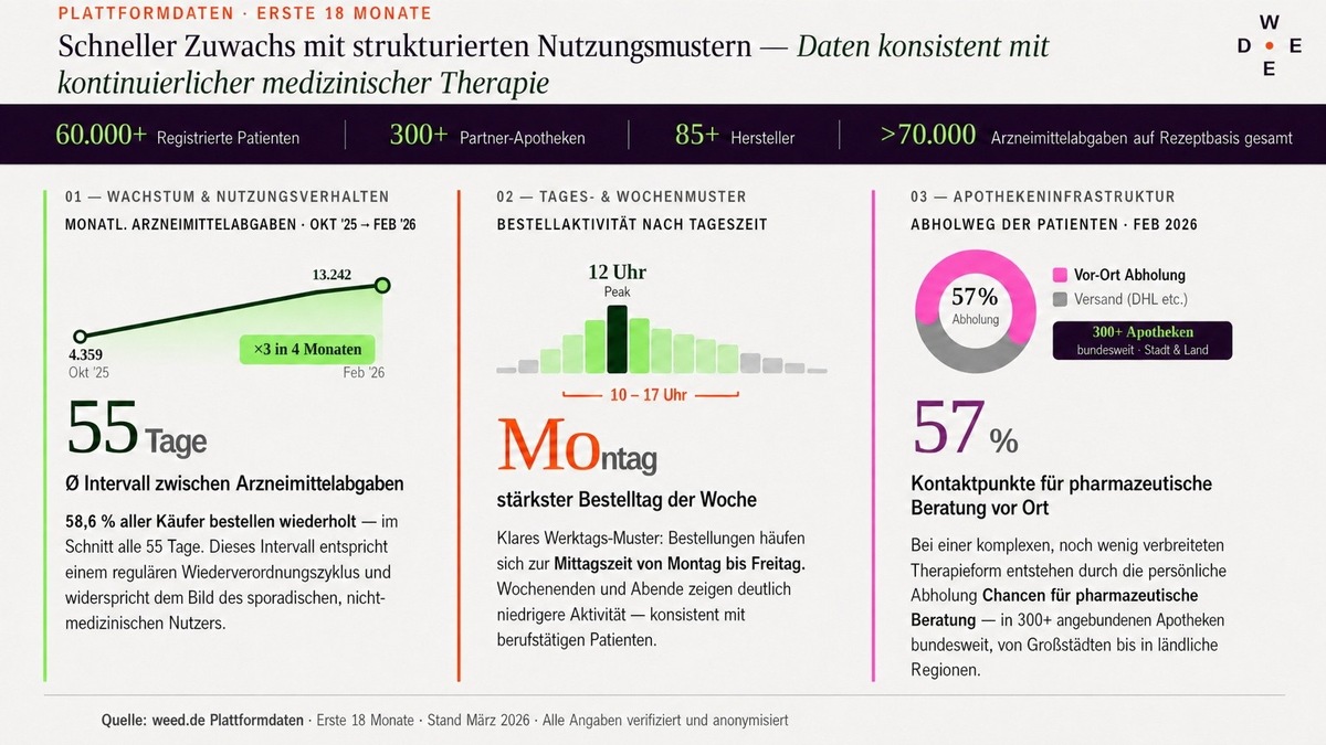 In nur vier Monaten (Oktober 2025 bis Februar 2026) haben sich die Arzneimittelabgaben auf Rezeptbasis verdreifacht. Über 60.000 registrierte Nutzer und mehr als 70.000 Arzneimittelabgaben verzeichnet die Plattform, die bundesweit mit mehr als 300 Apotheken und über 85 Herstellern vernetzt ist.