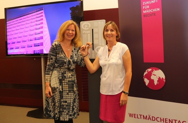 Schauspielerin Marion Kracht, die sich seit Jahren für Plans "Because I am a Girl"-Kampagne für Mädchenrechte einsetzt, drückte zum Auftakt einer bundesweiten Beleuchtungsaktion zum Welt-Mädchentag mit Staatssekretär Silberhorn symbolisch den Starthebel, um den Sitz des Entwicklungsministeriums, das elf Stockwerke hohe "Europahaus" im Herzen Berlins, in leuchtendes Pink zu tauchen. "Die Benachteiligung von Mädchen kennt viele Gesichter - mit dem Report verleiht Plan ihnen eine Stimme. Ihre Geschichten und Schicksale überzeugen uns alle davon, dass wir sie in Zukunft noch gezielter fördern müssen, damit die Überwindung der Armut gelingt", sagt Marion Kracht.
