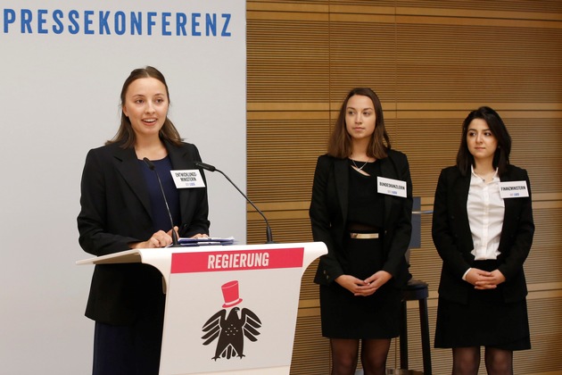 Am 11. Oktober ist Welt-Mädchentag. Anlass für drei junge Botschafterinnen der Kinderhilfsorganisation Plan International symbolisch die Regierung zu übernehmen. Als Bundeskanzlerin, Entwicklungsministerin und Finanzministerin gaben die drei Mädchen im Alter von 16 - 22 Jahren heute in Berlin eine Regierungserklärung mit Schwerpunkt Gleichberechtigung ab.