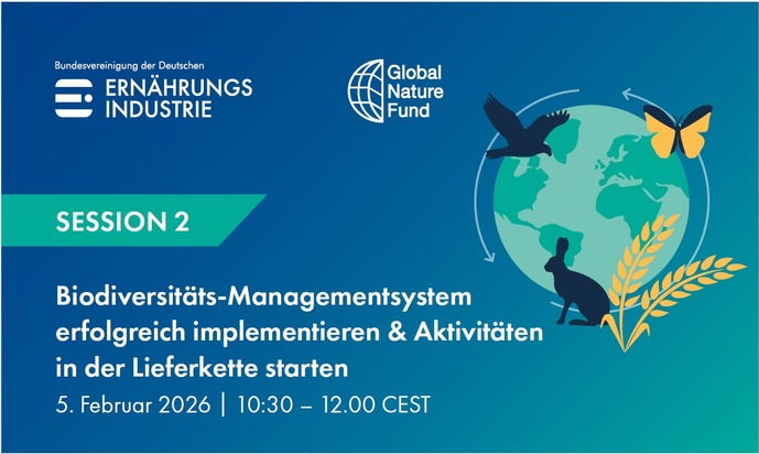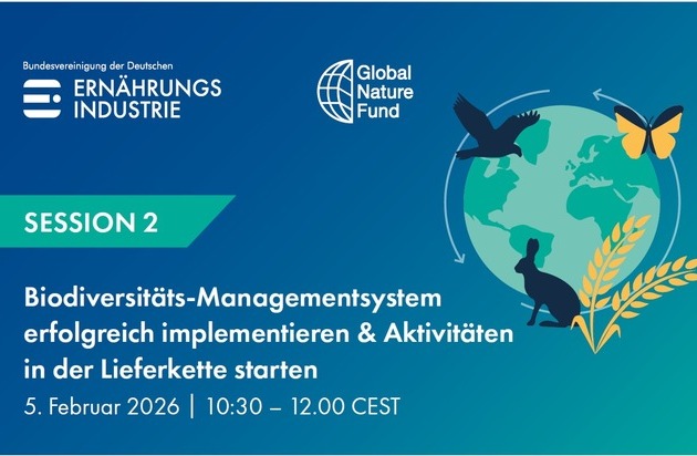 Bonn, 13.1.2026 – Der Global Nature Fund und die Bundesvereinigung der Deutschen Ernährungsindustrie (BVE) laden im Rahmen des EU-LIFE-Projekts „Fit for Biodiversity“ zu einer hochaktuellen Webinar-Reihe ein. Die Online-Seminare richten sich insbesondere an Manager:innen sowie Nachhaltigkeitsverantwortliche der Agri-Food-Branche, die ihre Unternehmen strategisch auf die wachsenden Risiken des Biodiversitätsverlusts vorbereiten wollen.