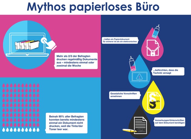 Eine von Epson initiierte Studie zum Druckverhalten von Familien in Deutschland zeigte, dass trotz der starken Verbreitung mobiler Geräte rund zwei Drittel aller Familien mindestens ein- oder zweimal die Woche Dokumente ausdrucken. Gründe hierfür sind neben der Sorge um die Flüchtigkeit elektronischer Dokumente (67 Prozent) auch der Wunsch, Anmerkungen an dem Dokument anzubringen (51 Prozent) sowie bestimmte gesetzliche Vorschriften (40 Prozent). Fehlendes Vertrauen in die Verfügbarkeit der Technologie (40 Prozent) war ein weiterer Grund vieler Befragten, auf Papierdokumente zu setzen. In der gleichen Umfrage stellte sich zudem heraus, dass rund 85 Prozent bereits einmal nicht drucken konnten, weil die Tinte beziehungsweise der Toner leer waren.