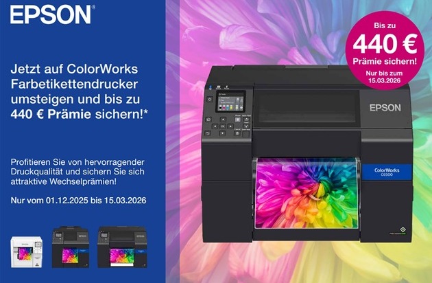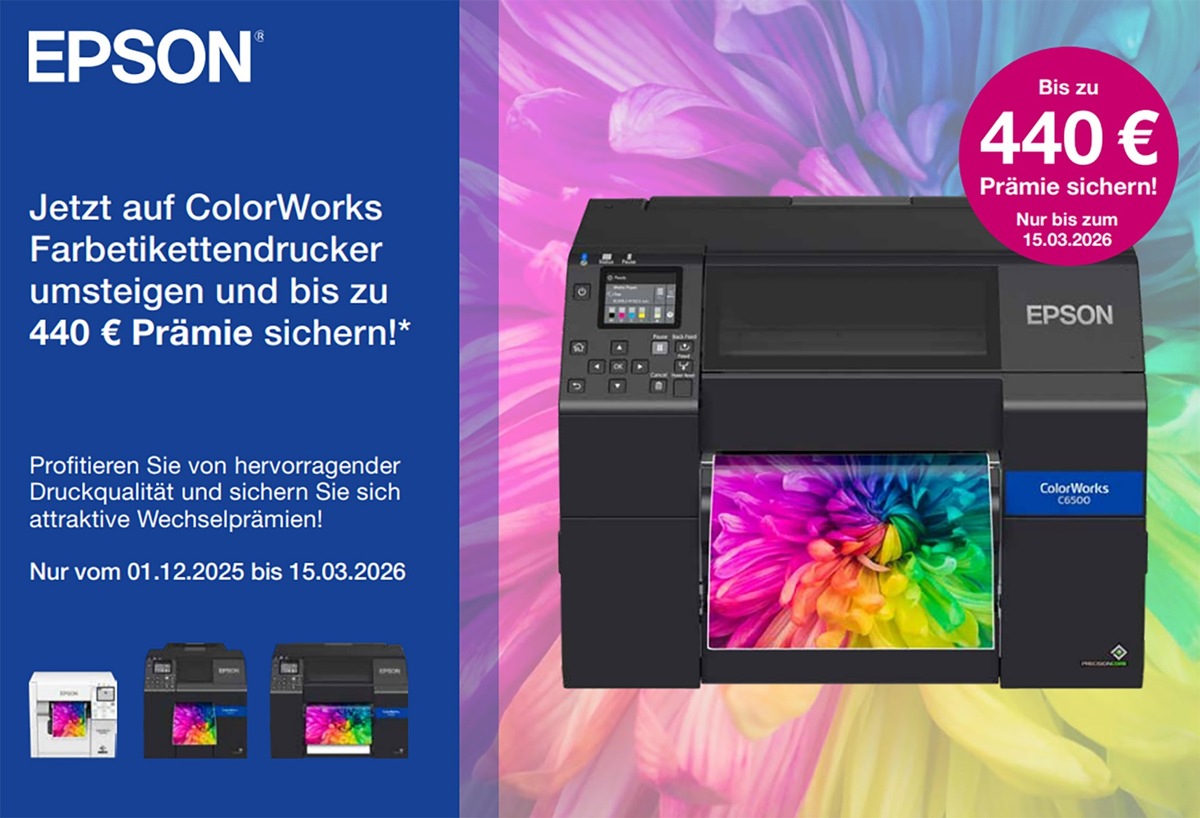 Düsseldorf, 10. Februar 2026 – Noch bis zum 15. März 2026 versüßt Epson Nutzern aus Deutschland, Österreich oder der Schweiz den Umstieg von Etikettendruckern anderer Fabrikate auf ausgewählte ColorWorks Farbetikettendrucker mit einer Prämie von bis zu 440 Euro. Wie üblich ist die Aktion nicht mit anderen Kampagnen kombinierbar und es sind auch nur bis zu maximal zehn Geräte pro Kunde anrechenbar. Detaillierte Teilnahmebedingungen der Aktion sowie eine Liste der zur Verfügung stehenden Geräte erfahren Interessent:innen aus dem Aktionsflyer.