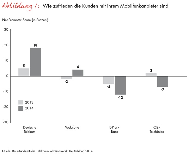 In einer repräsentativen Studie hat Bain Ende 2014 die Loyalität von Mobilfunk- und Festnetzkunden in Deutschland ermittelt. Dafür wurden insgesamt 2.125 Nutzer befragt. 1.759 Antworten entfielen dabei auf Mobilfunkunternehmen, 1.790 auf Festnetzanbieter, Mehrfachnennungen waren möglich. Die Studie erfasst die Zufriedenheit der Nutzer mit den Unternehmen, ihre Empfehlungsbereitschaft sowie ihre Verbesserungswünsche. Ein besonderes Augenmerk lag auf den bisher gemachten Erfahrungen mit Onlineangeboten. Die hohe Grundgesamtheit der Befragten ermöglicht einen Überblick über die Entwicklung der Kundenorientierung der großen deutschen Telekommunikationsunternehmen, vorhandene Stärken und Schwächen sowie noch unerschlossene Potenziale.