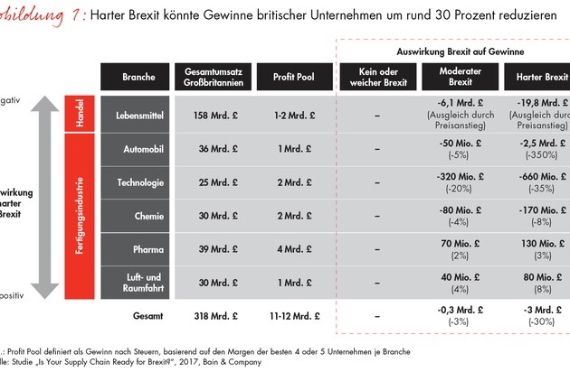 Risiken abfedernDie Spekulationen über die wirtschaftlichen Konsequenzen des Brexit haben die Unternehmen in Großbritannien stark verunsichert. Die Studie "Is Your Supply Chain Ready for Brexit?" der internationalen Managementberatung Bain & Company beleuchtet die Risiken des EU-Austritts. Der britischen Industrie droht im Fall eines harten Brexit, bei dem sich Großbritannien vollständig aus dem gemeinsamen EU-Binnenmarkt verabschiedet, ein Gewinneinbruch von bis zu 30 Prozent.
