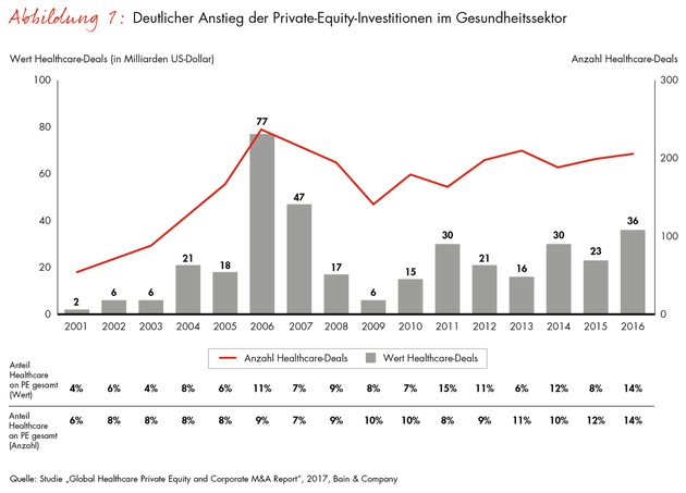 Das erheblich stärkere PE-Engagement in der Gesundheitsbranche stand weltweit im Gegensatz zu der ansonsten vorherrschenden Investitionszurückhaltung. 2016 sank das Volumen neuer Beteiligungen über alle Branchen hinweg um 23 Prozent. Dagegen belief sich der Anteil des Gesundheitssektors am gesamten PE-Investitionsvolumen weltweit auf über 14 Prozent und erreichte damit ein Allzeithoch. Dr. Franz-Robert Klingan, Partner bei Bain & Company und Co-Autor der Studie, erklärt: "Vielen Investoren vermittelt der Gesundheitssektor Sicherheit in turbulenten Zeiten. Denn früher oder später ist nahezu jeder auf Produkte und Services der Gesundheitsbranche angewiesen, unabhängig von Konjunktur und politischen Veränderungen. Deshalb ist auf lange Sicht kaum ein Sektor so attraktiv wie Healthcare."