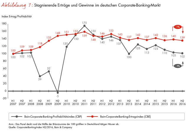 Der halbjährlich erhobene Bain-Corporate-Banking-Index basiert auf veröffentlichten Daten führender deutscher Banken. Das Panel deckt rund die Hälfte der Bilanzsumme der 100 größten in Deutschland tätigen Banken ab und konzentriert sich auf Finanzinstitute mit einem Schwerpunkt im Corporate-Banking und einer entsprechenden Segmentberichterstattung. Bei der erstmaligen Erstellung erfasste Bain für die Jahre 2007 bis 2012 zahlreiche Rohdaten jeder einzelnen Bank, darunter die Erträge (Zins- und Provisionsüberschuss), die Kostenstruktur (Verwaltungsaufwand), die Kreditrisikovorsorge, die Profitabilität (Ergebnis vor Steuern), das Eigenkapital und das Kreditvolumen. Die Wahl des Ausgangsjahrs 2007 ermöglicht Vergleiche zwischen dem letzten Jahr vor Ausbruch der globalen Finanzkrise und der aktuellen Situation.