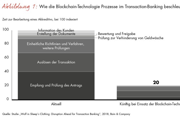 Anbieter ihre Position festigenKurze Nachricht, große Wirkung: Eher beiläufig hat die HSBC Mitte Mai 2018 über die erste Abwicklung eines Akkreditivs für eine Schiffsladung Sojabohnen per Blockchain-Technologie informiert. Danach nutzten alle Beteiligten dieser internationalen Handelsfinanzierung eine einzige digitale Plattform. In der Studie "Wolf in Sheep's Clothing: Disruption Ahead for Transaction Banking" zeigt die internationale Managementberatung Bain & Company auf, in welchem Maß Distributed Ledgers und andere digitale Technologien das Transaction-Banking in den kommenden Jahren verändern werden und wie traditionelle Banken handeln sollten.