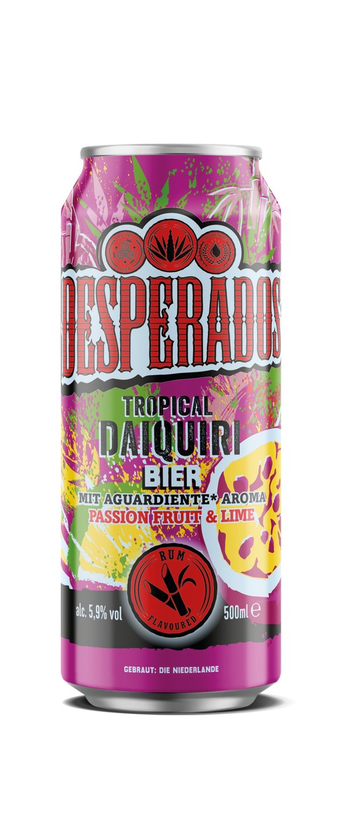 Berlin, 19.02.2026 – Desperados, die Biermarke mit Latin Vibes, ergänzt mit Tropical Daiquiri sein erfolgreiches Sortiment um eine Flavour-Innovation. Die neue Geschmacksvariante wird ab März 2026 in der 0,33-l-Flasche, 0,5-l-Dose und als 4 x 0,33-l-Multipack im deutschen Handel verfügbar sein. Aromen von Passionsfrucht und Limette positionieren die neue Sorte klar im Geschmacksprofil „tropisch-fruchtig“ – als ideale Ergänzung zum zitrischen Desperados Original und dem minzig-botanischen Desperados Mojito.