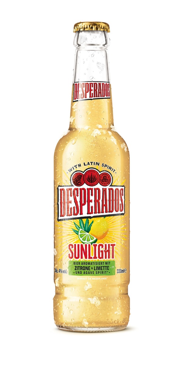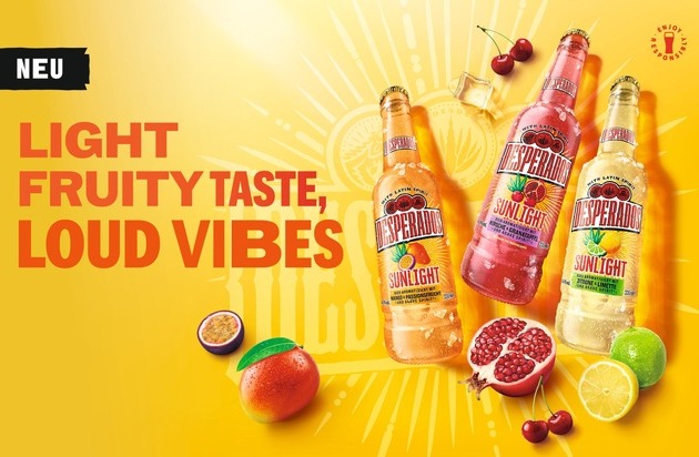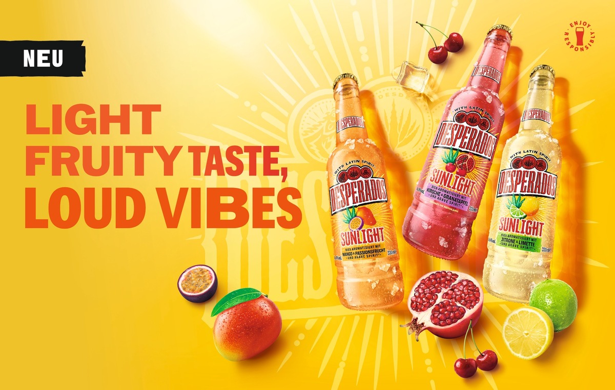 Berlin, 30.04.2026 – Desperados, die Biermarke mit Latin Vibes, baut ihr Sortiment aus und schafft zusätzliche Impulse im Handel. Mit Desperados Sunlight startet eine neue, eigenständige Produktlinie mit gleich drei Innovationen: Desperados Sunlight Zitrone & Limette, Sunlight Mango & Passionsfrucht und Sunlight Kirsche & Granatapfel. Die Varianten sind ab sofort für kurze Zeit exklusiv als 0,33-l-Flaschen im Mix-Display bestellbar. Die neue Desperados Range Sunlight unterscheidet sich klar vom Desperados Original Sortiment, sowohl geschmacklich als auch beim Alkohol- und Zuckergehalt. Damit bedient Desperados Sunlight genau den Geschmack der erwachsenen Gen Z und schafft neue Konsumanlässe.