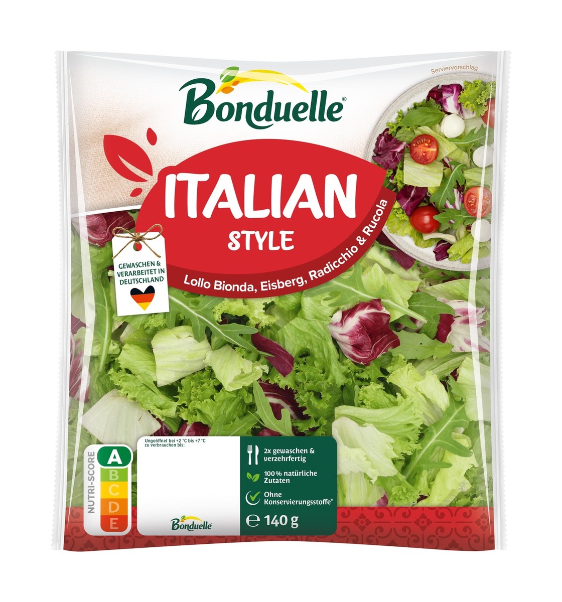 In der Premium Range setzt Bonduelle erstmals auf großformatige Produktfotografien, die die Salatmischung angerichtet in einer Bowl zeigen. Diese ansprechende Inszenierung steigert den sogenannten „Taste Appeal“ und rückt den Genussmoment in den Fokus. Die Basis Range nutzt an derselben Stelle eine Abbildung der enthaltenen Salat- oder Gemüsesorten. Durch diese visuelle Differenzierung wird die Orientierung im Sortiment erleichtert und die Kaufentscheidung gezielt unterstützt.
