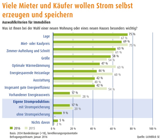 "2016 scheinen sich weniger Mieter und Käufer für herkömmlich empfohlene Energiemaßnahmen wie Wärmedämmung und die energetische Bewertung durch einen Energieausweis zu interessieren. Dafür steigt das Interesse der Verbraucher daran, ihren Strom selbst zu erzeugen und zu speichern. Haushalte können so ihre Energiekosten reduzieren und sich unabhängiger machen", sagt Gero Lücking, Geschäftsführer Energiewirtschaft von LichtBlick.