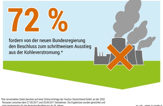 Fast drei Viertel der Menschen in Deutschland (72 Prozent*) erwarten von der neuen Bundesregierung einen schrittweisen Ausstieg aus der Kohleverstromung. 41 Prozent fordern sogar, dass der Ausstieg möglichst schnell erfolgt. Das hat eine repräsentative Umfrage des Meinungsforschungsinstituts YouGov im Auftrag von WWF und LichtBlick ergeben. Zwischen 27. und 29. September wurden dafür 2052 Personen ab 18 Jahren befragt. "Die Zeit des Aufschiebens ist vorbei: Die neue Regierung hat nicht nur die Wissenschaft im Nacken, sondern auch die eigene Bevölkerung. Denn die Mehrheit hat verstanden, dass Kohle ihre Zukunft und die ihrer Kinder aufs Spiel setzt", so Michael Schäfer, Leiter des Fachbereichs Klimaschutz und Energiepolitik beim WWF Deutschland.