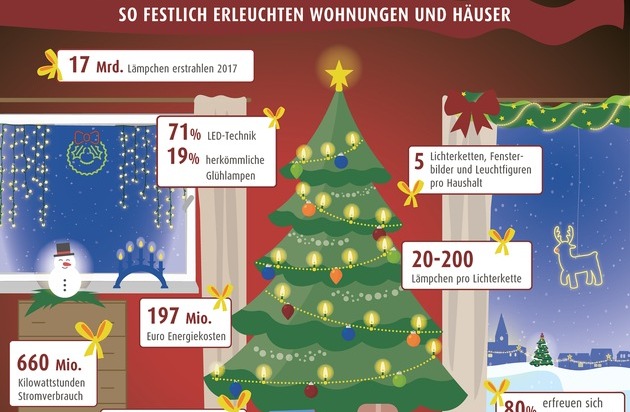 Weihnachtliche Lichterketten, leuchtende Fensterbilder und Bögen: In Deutschland funkeln Häuser und Wohnungen in diesem Winter ganz besonders hell. Etwa 17 Milliarden Lichtlein werden in den kommenden Wochen in Deutschland für festliche Stimmung sorgen. Aufgrund der sich immer stärker durchsetzenden LED-Technik steigt die Zahl der einzelnen Lämpchen pro Weihnachts-Leuchtartikel deutlich an, gleichzeitig sinkt der Stromverbrauch. 71 Prozent der Verbraucher geben an, ausschließlich oder überwiegend LED-Weihnachtsbeleuchtung zu verwenden. Nur 19 Prozent setzen noch ganz oder hauptsächlich auf herkömmliche Lichterketten.