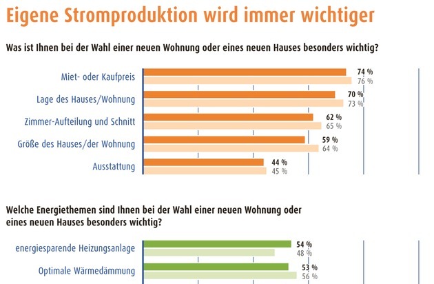 So geben aktuell fast ein Viertel der Befragten (24 Prozent) an, dass ihnen eine eigene Stromproduktion mit Stromspeicherung bei der Wohnungs- oder Hauswahl wichtig ist. Bei der vorherigen Umfrage war dieses Kriterium nur für 16 Prozent der Befragten relevant. Ein noch größerer Zuwachs zeigt sich bei der Lademöglichkeit für Elektrofahrzeuge: Bei der aktuellen Umfrage ist dies 11 Prozent der Bundesbürger wichtig - fast doppelt so viele wie im Vorjahr möchten diese Vorrichtung im neuen Haus oder der Mietswohnung nicht missen (Vorherige Umfrage: 6 Prozent).