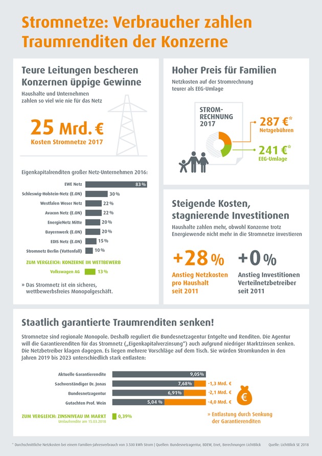 Laut einer Auswertung von LichtBlick genehmigte die Bundesnetzagentur im Jahr 2017 Netzentgelte in Höhe von 25 Milliarden Euro. Viele Netzbetreiber erzielen mit ihren Investitionen in einem weitgehend risikofreien Monopolgeschäft sehr hohe Eigenkapitalrenditen von 20 bis 30 Prozent. Während die Netz-Investitionen in Deutschland seit 2011 stabil geblieben sind, haben sich die Entgelte für Stromkunden seitdem um 28 Prozent erhöht.
