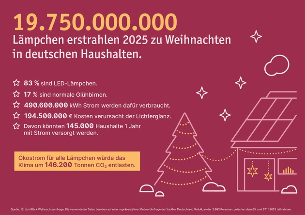 Die verwendeten Daten beruhen auf einer Online-Umfrage der YouGov Deutschland GmbH, an der 2.063 Personen zwischen dem 05.11. und dem 07.11.2025 teilnahmen. Die Ergebnisse wurden gewichtet und sind repräsentativ für die deutsche Bevölkerung ab 18 Jahren. Die Berechnungen zur Anzahl der Weihnachtslämpchen, des Stromverbrauchs und des CO2-Ausstoßes sind von LichtBlick vorgenommen worden.