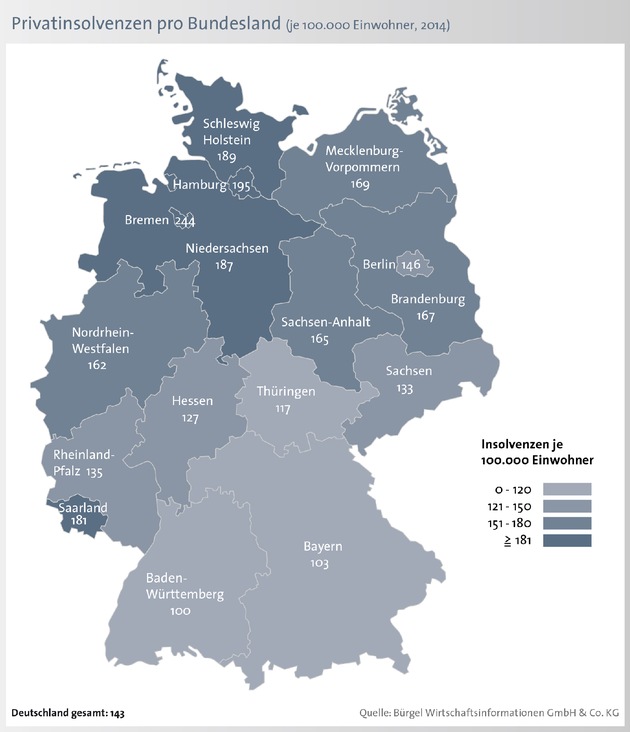 Bei der differenzierteren Betrachtung nach Privatinsolvenzen, bezogen auf die Einwohnerdichte, zeichnet sich indes ein starkes Nord-Süd-Gefälle ab. Demnach verbuchen insbesondere die nördlichen Bundesländer eine hohe Zahl an Privatpleiten - allen voran Bremen mit 244 Fällen je 100.000 Einwohner. Es folgen Hamburg mit 195 Privatinsolvenzen pro 100.000 Einwohner, Schleswig-Holstein (189) und Niedersachsen (187). Am wenigsten Insolvenzen ereigneten sich 2014 in Baden-Württemberg mit 100 Insolvenzen je 100.000 Einwohner und Bayern (103). Auch in Thüringen (117 Fälle je Einwohner), Hessen (127) und Sachsen (133) lagen die Werte unter dem Bundesdurchschnitt von 143 Insolvenzen je 100.000 Einwohner.