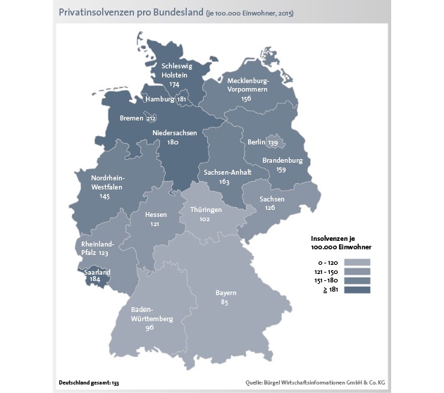 Das Bundesland Bremen nimmt bei der Auswertung der Privatinsolvenzen eine besondere Rolle ein. Im Ranking der absoluten Zahlen steht Bremen mit 1.406 privaten Insolvenzen am besten da. Diese Reihenfolge ändert sich jedoch, wenn die relativen Zahlen - Privatinsolvenzen je 100.000 Einwohner - in die Analyse einbezogen werden. Mit 212 Privatinsolvenzen je 100.000 Einwohner steht Bremen demnach an der Spitze der Statistik. Am zweithäufigsten wurden im Jahr 2015 im Saarland Privatinsolvenzen gemeldet. Hier kommen auf 100.000 Einwohner 184 Privatinsolvenzen. Es folgen mit Hamburg (181), Niedersachsen (180) und Schleswig-Holstein (174) ausnahmslos norddeutsche Bundesländer. Damit setzte sich das sogenannte Nord-Süd-Gefälle bei den Privatinsolvenzen - mit Ausnahme des Saarlandes - auch im Jahr 2015 fort. Weniger Privatpleiten gab es in den südlichen Bundesländern. In Bayern meldeten nur 85 von 100.000 Bürgern eine Insolvenz an. Ebenfalls niedrige Werte lieferten Baden-Württemberg (96) und Thüringen (102). Der Bundesdurchschnitt lag im Jahr 2015 bei 133 Privatinsolvenzen je 100.000 Einwohner.