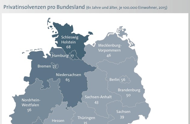Hamburg nimmt in der aktuellen Auswertung eine besondere Rolle ein. Auf der einen Seite sinken die Privatinsolvenzen in der Altersgruppe "61 Jahre und älter" um 10 Prozent und damit bundesweit am stärksten. Auf der anderen Seite meldeten in der Hansestadt - im relativen Vergleich - die meisten Privatpersonen eine Insolvenz an (77 Privatinsolvenzen je 100.000 Einwohner in der Altersgruppe "61 Jahre und älter"). Den stärksten Anstieg im Vergleich zum Jahr 2014 gab es im Saarland. Hier erhöhte sich die Zahl der Privatinsolvenzen in der Altersgruppe ab 61 Jahren um 14,5 Prozent. Einen zweistelligen Zuwachs gab es ebenfalls in Berlin (plus 10,3 Prozent). Neben Hamburg hat sich die Situation in Schleswig-Holstein am deutlichsten entspannt (minus 8,3 Prozent). Im relativen Vergleich gab es nach Hamburg im Saarland (73 Insolvenzen je 100.000 Einwohner in der Altersgruppe "61 Jahre und älter"), in Bremen (72) und in Schleswig-Holstein (68) die meisten Privatinsolvenzen. Unter dem Bundesdurchschnitt (49) rangieren vor allem Thüringen (35), Baden-Württemberg (37), Bayern (38) und Sachsen (39).
