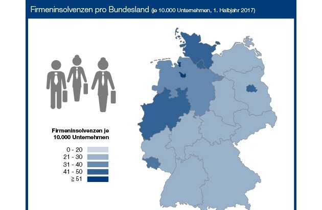 Der bundesweite Trend sinkender Firmeninsolvenzen zeigt sich in den Bundesländern Baden-Württemberg (plus 14,8 Prozent), Berlin (plus 13,5 Prozent) und Thüringen (plus 2,9 Prozent) nicht. Den deutlichsten Rückgang an Firmeninsolvenzen gab es im 1. Halbjahr 2017 im Saarland. Hier wurde im Vergleich zum Vorjahreszeitraum knapp ein Drittel weniger Firmenpleiten registriert (minus 32 Prozent).