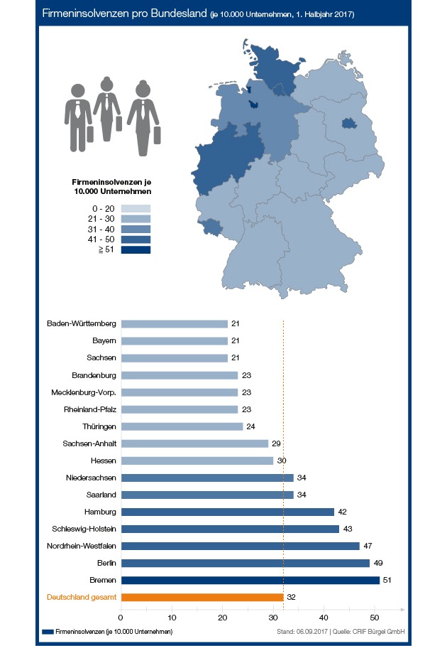 Der bundesweite Trend sinkender Firmeninsolvenzen zeigt sich in den Bundesländern Baden-Württemberg (plus 14,8 Prozent), Berlin (plus 13,5 Prozent) und Thüringen (plus 2,9 Prozent) nicht. Den deutlichsten Rückgang an Firmeninsolvenzen gab es im 1. Halbjahr 2017 im Saarland. Hier wurde im Vergleich zum Vorjahreszeitraum knapp ein Drittel weniger Firmenpleiten registriert (minus 32 Prozent).