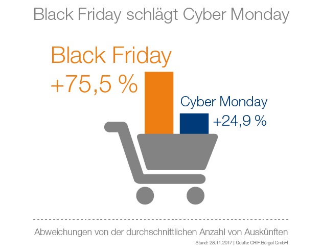 Der aus den USA stammende "Black Friday" gewinnt in Deutschland für Online-Händler immer mehr an Bedeutung. Dies belegt eine aktuelle Analyse der Wirtschaftsauskunftei CRIFBÜRGEL. So erhöhte sich am 24. November 2017, dem diesjährigen "Black Friday", die Anzahl der bei CRIFBÜRGEL eingegangenen Bonitätsabfragen seitens der Kunden aus den Bereichen Handel, E-Commerce und Factoring gegenüber der durchschnittlichen Abfrageanzahl an einem normalen Freitag um 75,5 Prozent. Auch am "Cyber Monday" registrierte CRIFBÜRGEL mehr Aktivitäten der Online-Schnäppchenjäger: Die Abfragen lagen rund ein Viertel (plus 24,9 Prozent) über den durchschnittlichen Zahlen an einem Montag. Der Vergleich zwischen den beiden prominenten Shopping-Tagen des Jahres zeigt, dass die absoluten Bonitätsabfragen am Black Friday um 23,9 Prozent höher waren als am Cyber Monday.